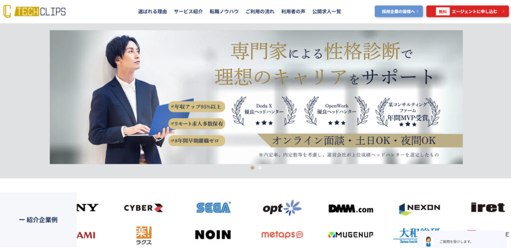 最大の特徴は、年収1,000万円を超えるハイクラス案件を豊富に扱っている点。大手企業から勢いのあるスタートアップまで、幅広い選択肢の中から個人の価値観やキャリア観にぴったりの企業を提案してくれます。