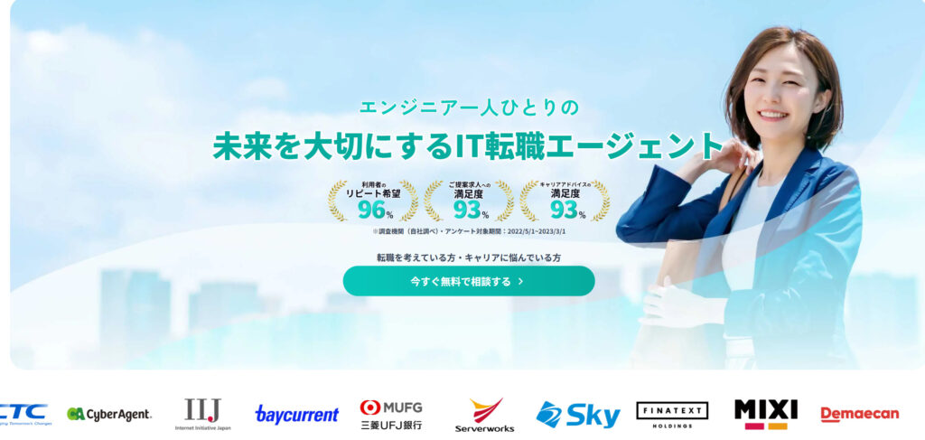 キャリアコンサルタント全員が現役のエンジニアであるかなり信頼できる転職エージェント。技術的なバックグラウンドを持つプロが担当するため、スキルや実績を正確に評価し、企業へ効果的にアピールすることで、利用者の年収アップ率は93%という驚異的な数字を記録しています。