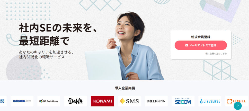 「客先常駐のない働き方をしたい」というエンジニアの声を代弁する、国内最大級の社内SE特化型転職メディアです。事業会社の社内SEや自社開発、情報システム部門の求人に特化しており、常時5,000件以上の厳選された案件を保有。一人あたり平均25.6社という豊富な提案を受けられるのが特徴です。