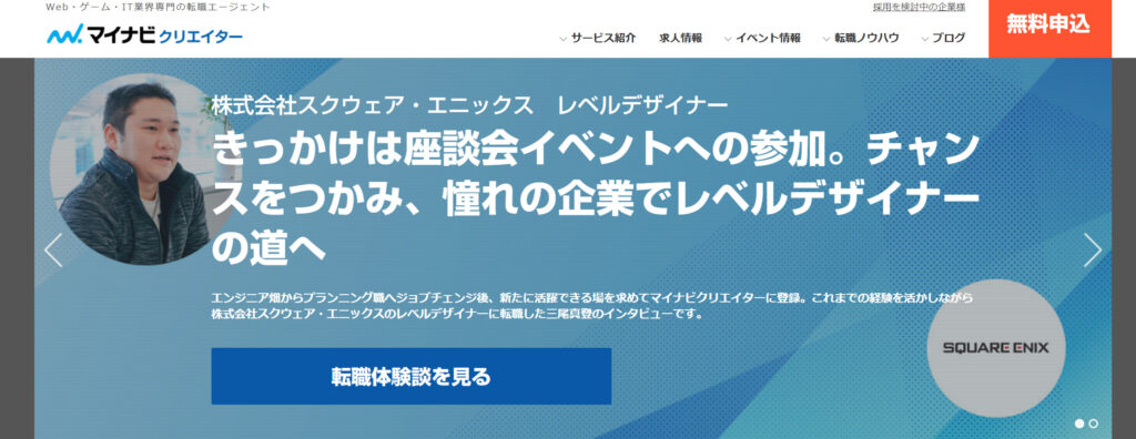 また、マイナビならではの業界トップクラスの求人数を背景に、同業種内でのキャリアアップはもちろん、異業種からのWeb・ゲーム業界への挑戦も強力にバックアップ。20代〜30代の若手・中堅クリエイターにとって、専門的な視点と手厚いフォローを同時に受けられる、非常に心強いエージェントです。