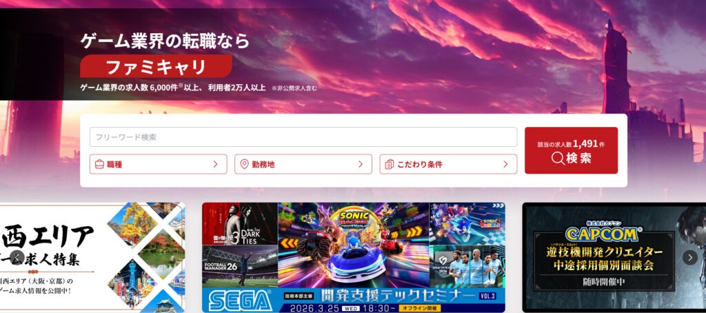 ゲームファンにおなじみの「ファミ通」と、クリエイティブ業界に強いクリーク・アンド・リバー社が共同運営する、ゲーム業界特化型の転職エージェントです。上場企業としての信頼背景と、業界内のほぼすべての求人を網羅する圧倒的な情報量にあります。